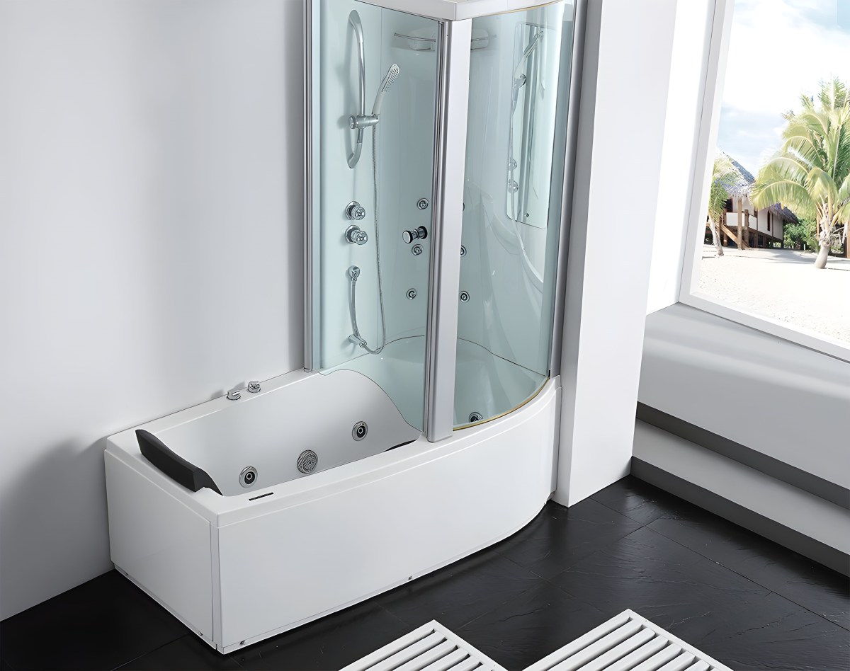 Внешние свойства акриловой ванны Gemy G8040 B R также заслуживают внимания. Ванна имеет асимметричную форму, что придаёт ей современный и стильный вид. Белый цвет и глянцевая поверхность создают ощущение чистоты и свежести. Фурнитура и форсунки выполнены в хромированном цвете, что добавляет изделию элегантности и визуальной привлекательности.