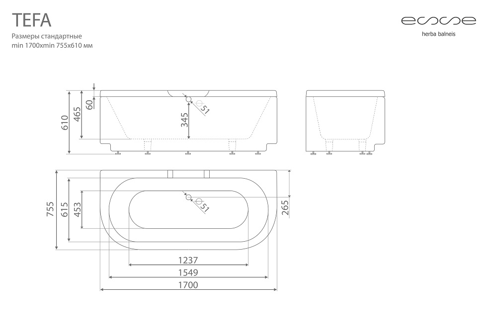 Прямоугольная ванна Esse «Tefa» создана из прямых форм,что обеспечивает не только надежность, но и является более гигиеничной, поскольку нет изгибов в которых могут оставаться загрязнения и собираться микробы.